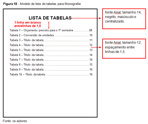 Elemento opcional que exibe a lista de tabelas, de acordo com a ordem apresentada no texto, seguidas dos números de suas respectivas páginas.