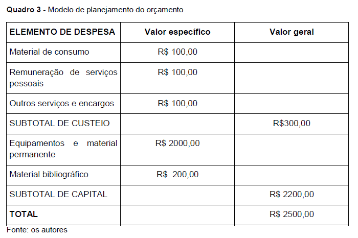 As agências financiadoras de projetos de pesquisa exigem que os mesmos sejam acompanhados de orçamento, que constitui um planejamento de valores necessários para executar o estudo. Mesmo quando não se pretende o financiamento para a execução de um projeto, o orçamento bem estudado é útil para que se tenha uma previsão de quanto se terá de despender para realizar a pesquisa.
